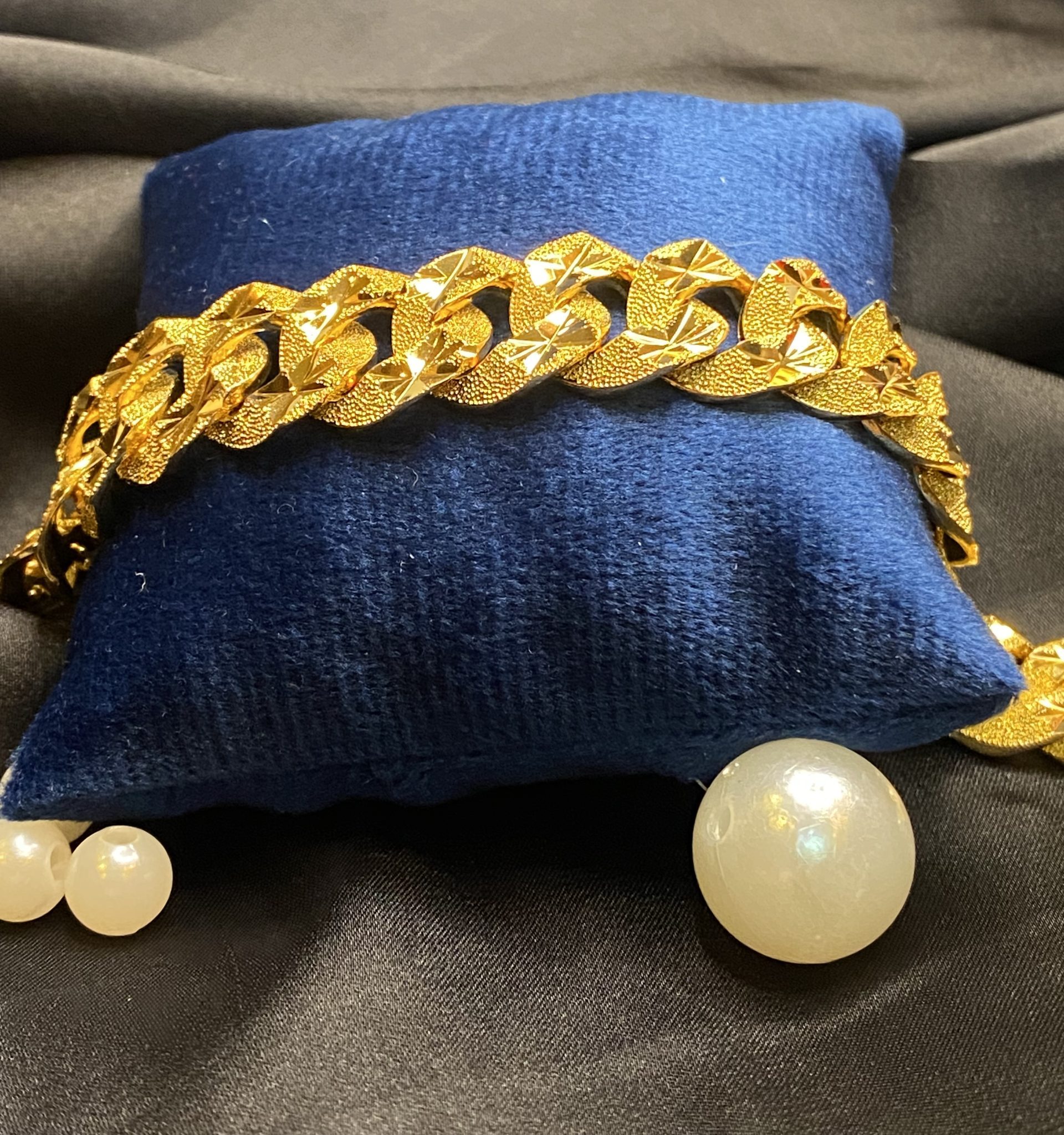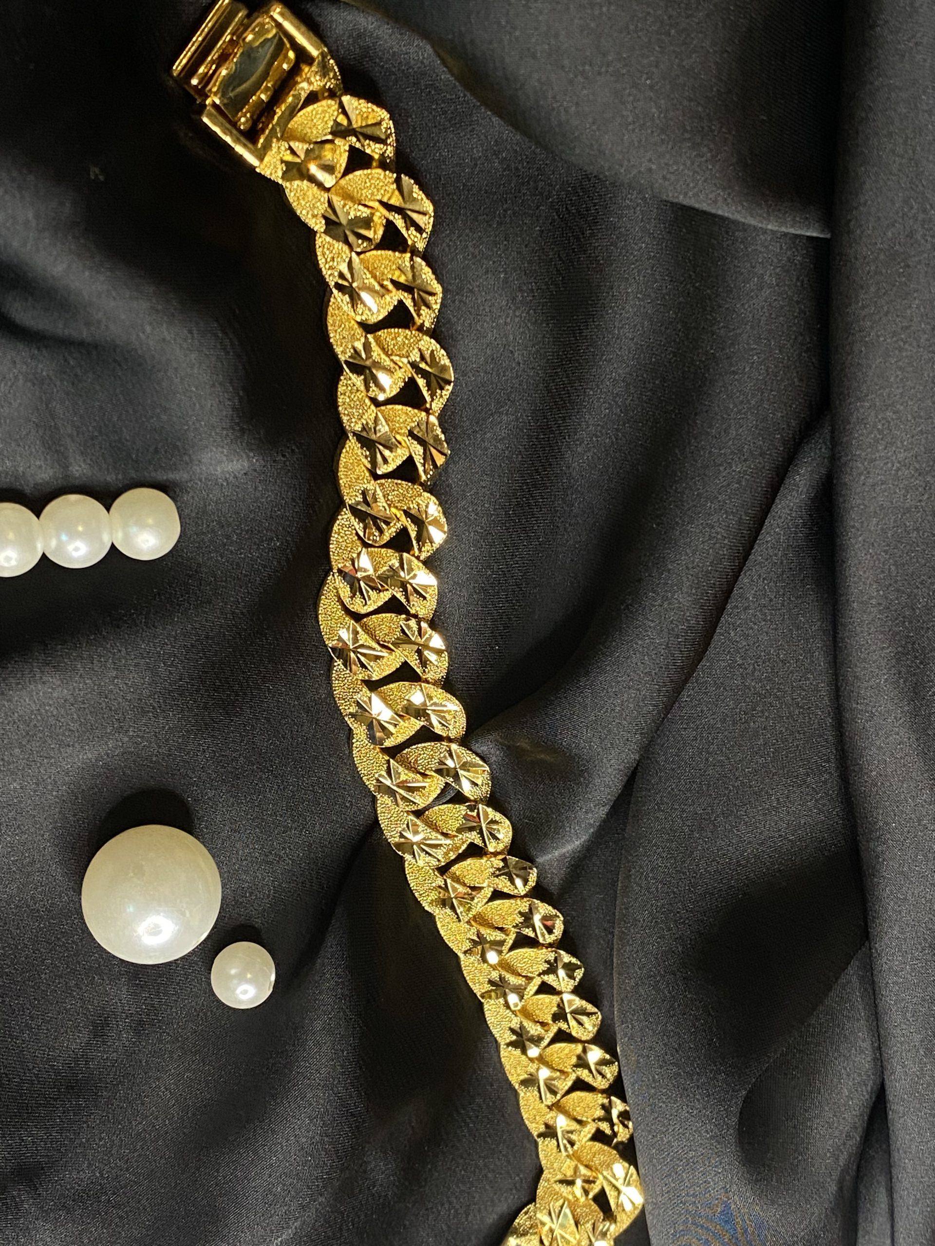 1 karat gold plated bold link bracelet. This bold and trendy bracelet adds a touch of glamour and style to any outfit.