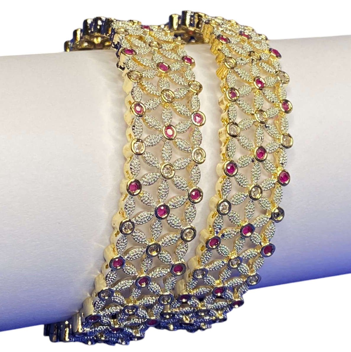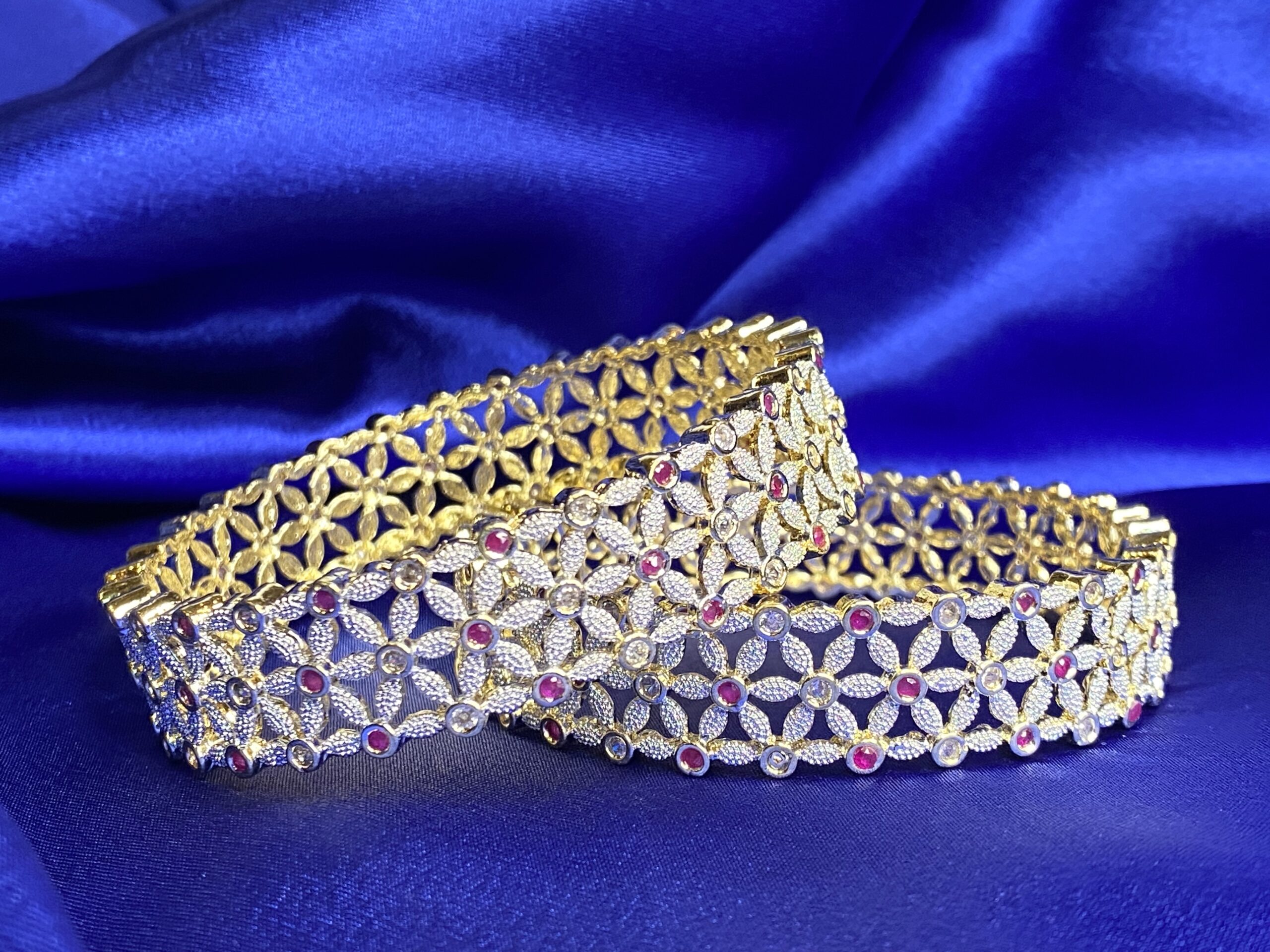 An intricate floral design with the hint of red by adding stones to it. A perfect blend of traditional and modern designs.